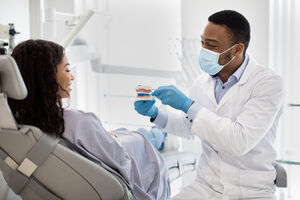 Black man wearing facemask holding box standing in front of yellow background in studio