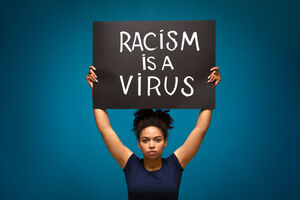 Hands of Black man checking time on his watch while standing on road in forest during sunny day