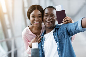 Black man using laptop with his girlfriend hugging him from behind while sitting on sofa in living room at home