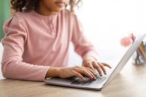 Cheerful Asian boy student with eyeglasses looking away while sitting at table with laptop, notebook, and pencils living room at home