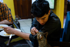 Black teenage boy with cerebral palsy in wheelchair having fun playing with caucasian teacher at home