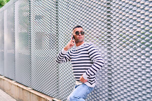 Serious African American man having phone call looking away standing and leaning on wall near building in city on sunny day