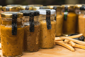 Closed glass bottles with yellow homemade blended vegetables placed on table