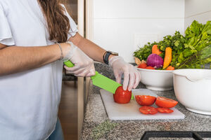 Female in gloves cutting onions on chopping board on counter with assorted vegetables in kitchen