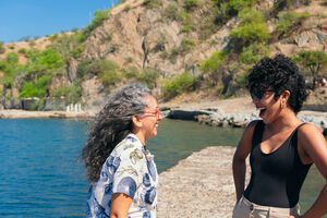 Hispanic and Asian women watching videos on smartphone while sitting outdoors