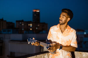 Hispanic man playing ukulele while standing on rooftop of building in city at night