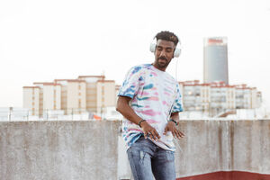 Hispanic man wearing headphones dancing while listening to music with eyes closed standing on balcony of building in city