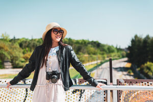 Smiling Chinese female holding photo camera standing on bridge on sunny day