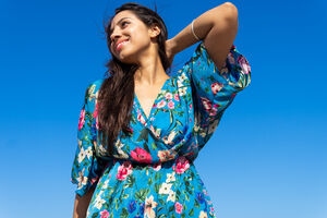 Silhouette of Black man pointing away finger standing sideways against blue background