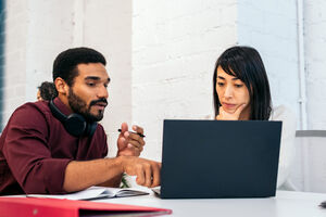 Smiling Asian woman with glasses sitting at table with laptop and coffee cup