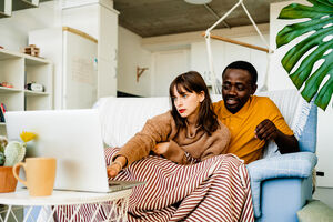 Shirtless Black man showing laptop to caucasian wife while bottle feeding her mixed-race baby boy sitting close together on bed in bedroom at home
