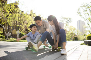 Smiling Chinese family decorating for Chinese New Year while standing at home