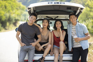 Smiling Chinese men standing with female friends sitting at the back of car parked on roadside on sunny day