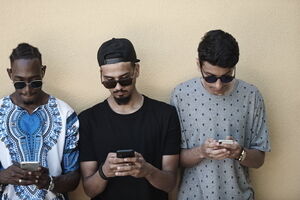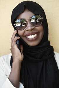 Smiling Black woman wearing hijab using smartphone sitting at counter table with laptop and tablet in office