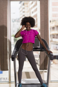 Smiling Black woman with afro wearing pink shirt and earphones standing on treadmill in gym