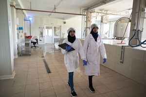 Middle Eastern female factory workers in hijab and white uniforms walking during work in local cow and goat milk cheese food production company