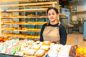 Hispanic female baker in apron standing at counter with different breads in bakery