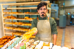 Hispanic male baker in apron arranging pastries using tong while standing at counter in bakery shop