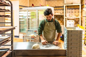 Close-up of hands of Hispanic male baker removing artisan baked puff pastry palms from the oven using a wooden peel in bakery