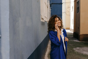 Smiling Hispanic woman looking away having phone call while sitting at table with laptop in living room at home