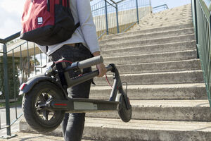 Smiling Black man with headphones around neck holding laptop while standing in front of gray wall in office