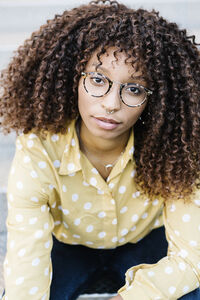 Smiling African American female student listening to music through wireless headphones while sitting on steps in campus