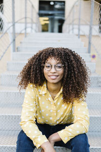 Smiling African American female student with curly hair holding smartphone sitting on steps in campus