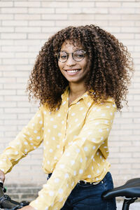 Smiling African American female student with backpack standing in front of wall in campus
