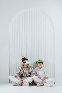 Smiling Hispanic bearded man looking up standing against brick wall outdoors during daytime