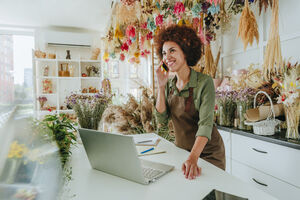 Asian business woman holding smartphone while standing and leaning on railings outdoors on sunny day