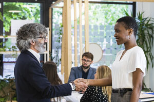 Black man with afro bumping fists with caucasian male friend greeting each other while standing on city street during daytime