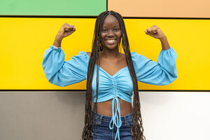 Smiling Black woman with red braided hair and arms raised standing in park during daytime