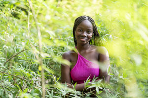 Smiling Black woman with red braided hair leaning on glass during daytime