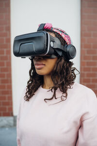Asian female vlogger with chin leaning on hand wearing headset recording herself on smartphone while sitting at table with laptop in front of ring light in dark room at home
