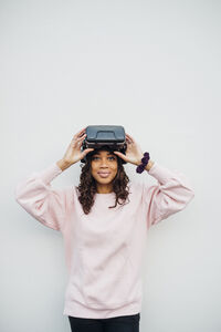 Cropped image of Chinese woman holding small globes while standing in front of yellow wall