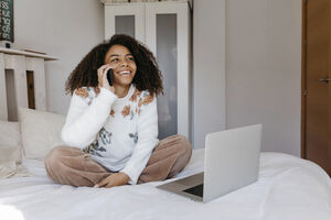 African American woman with curly hair sitting with legs crossed on counter in coffee shop