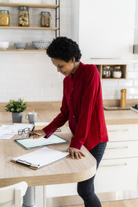 Black businessman using tablet sitting on wooden chair with feet on table in balcony during daytime