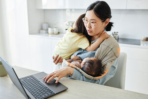 Black woman using tablet sitting on chair at table with food in home kitchen