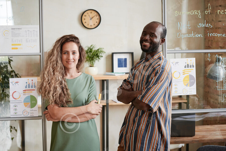 Smiling mixed-race male student in eyeglasses standing crossed arms near book shelves in library