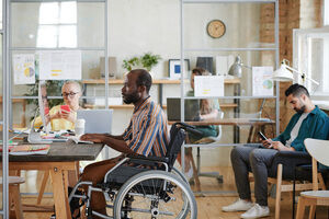 Smiling mixed-race male student looking away sitting at table beside other students in library