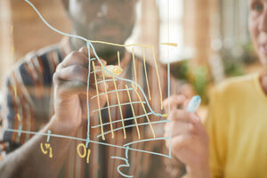 Mixed-race male looking up while holding pencil and paper sitting at table beside female student in library