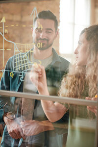 Mixed-race female student holding pencil looking at male student while sitting at table with laptop in library