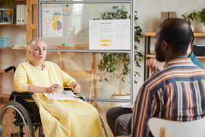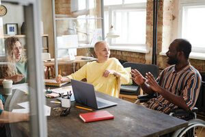 Group of students looking down having conversation while sitting together at table in library