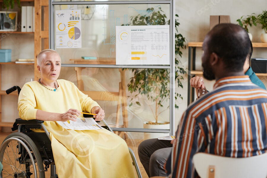 Black woman in headwrap and gloves planting seedlings in pots while husband is carrying box walking in greenhouse during daytime