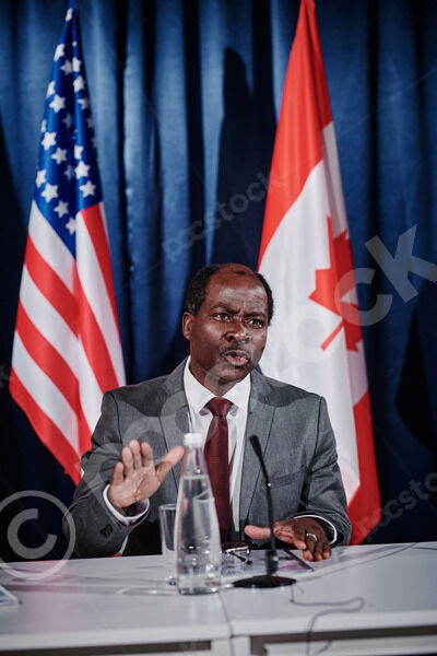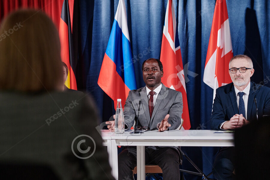 Close up image of Black male politician giving speech with caucasian male colleague sitting beside him during media conference in office