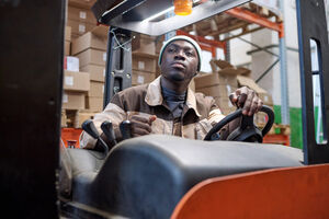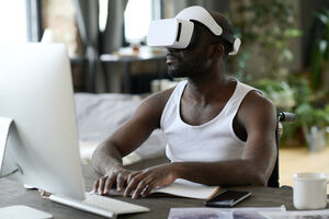 Black woman holding and looking on digital tablet sitting on sofa at home