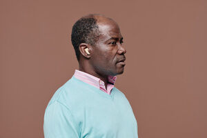 Smiling Black drummer man holding drumstick sitting in studio during daytime
