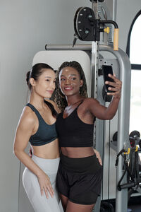 Asian female grocery store worker wearing face mask standing against brown background in studio