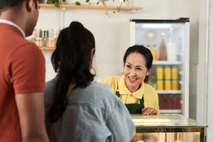 Vietnamese female barista in apron assisting customers while standing at counter in cafe
