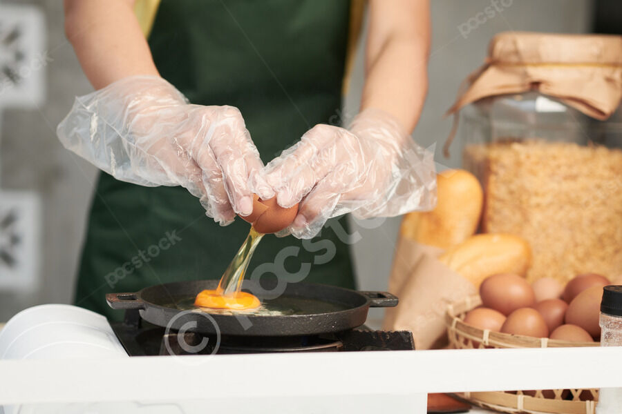 Cropped image of Vietnamese woman in apron and plastic gloves frying eggs for sandwich while standing in her cart at local food stall
